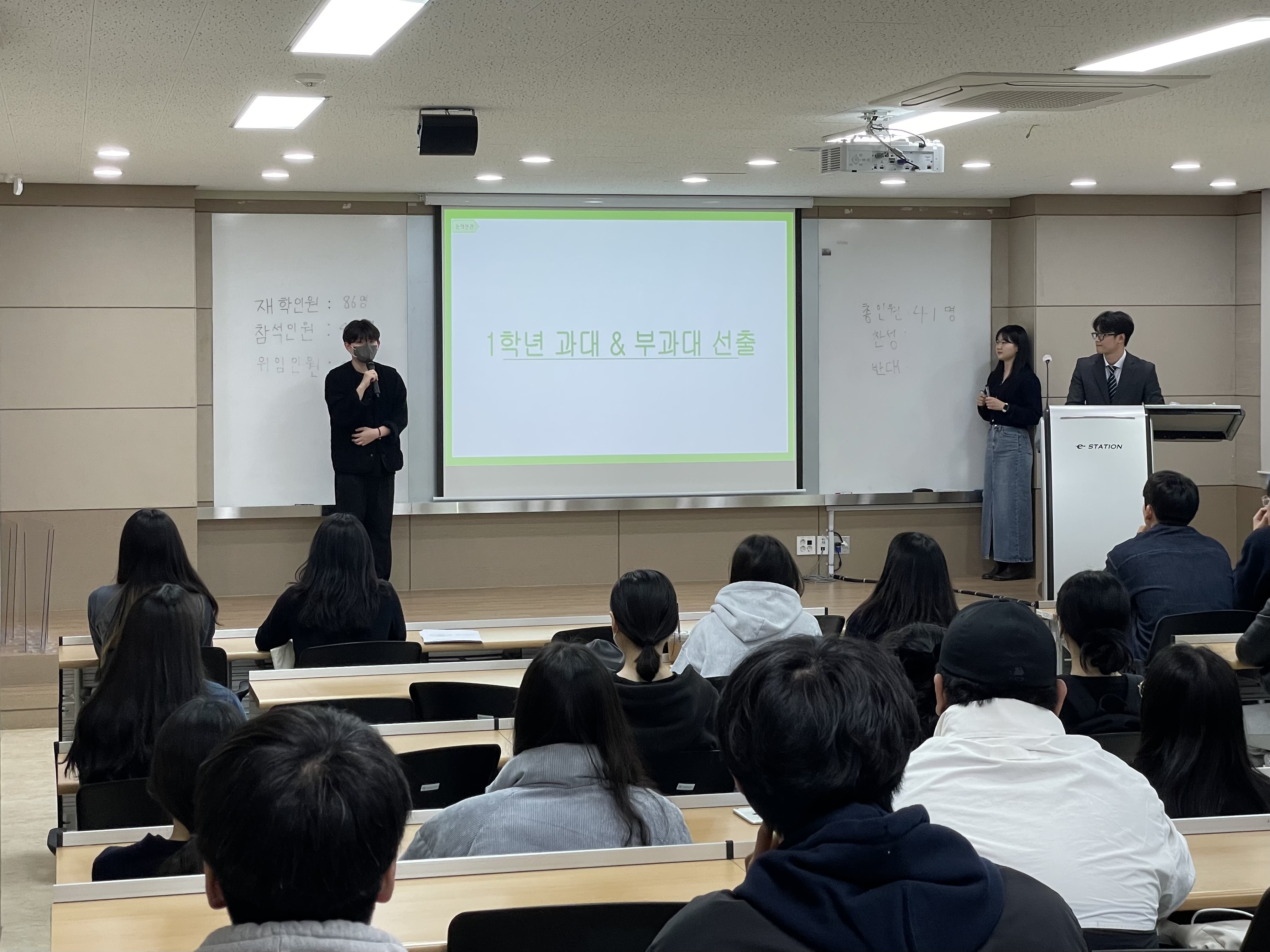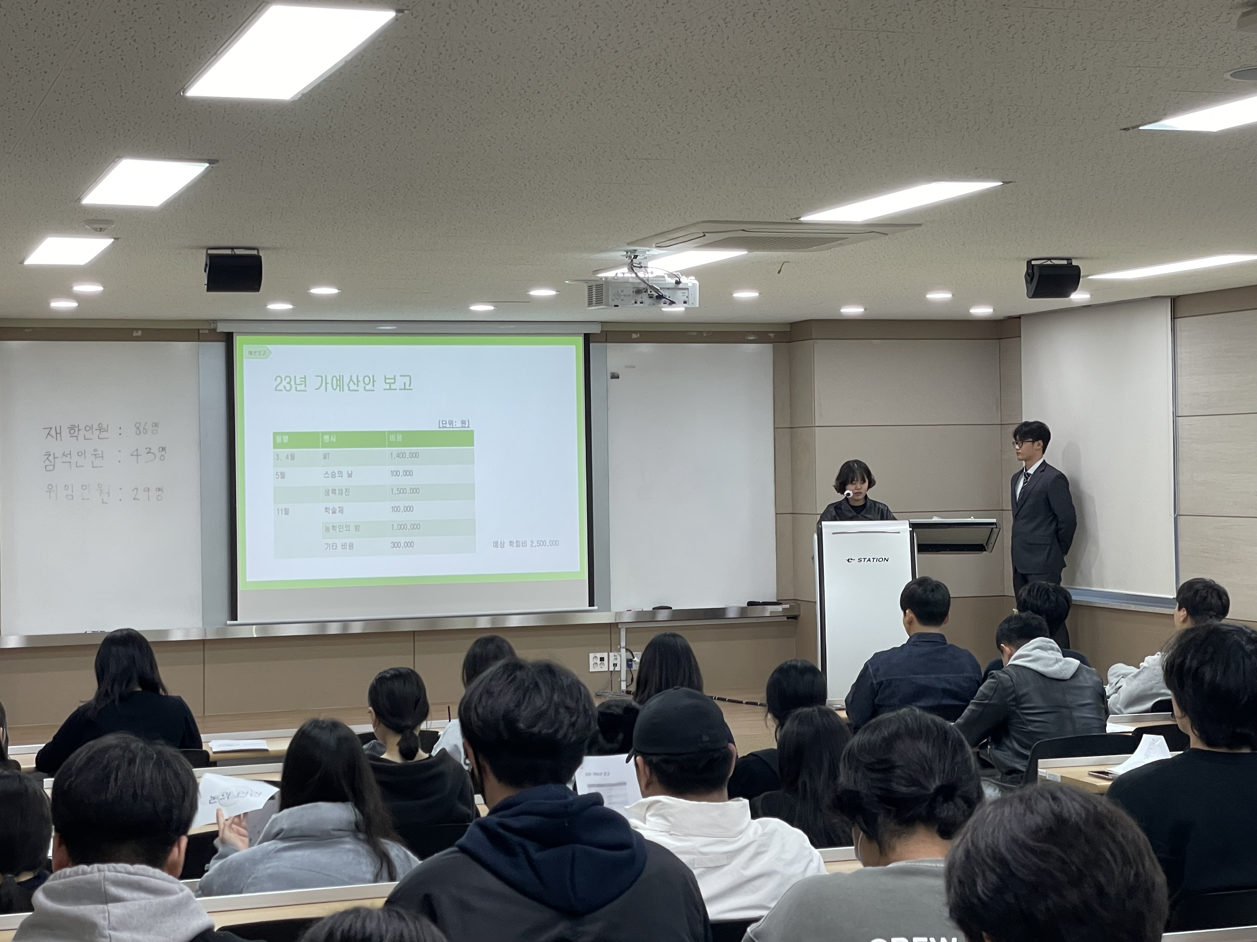이번 정기총회는 2023학년도 1/2월 지출내역, 행사계획 및 가예산안 보고, 세칙 변경 보고, 각 학년 과 대표 선출로 진행되었습니다.